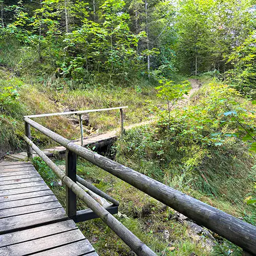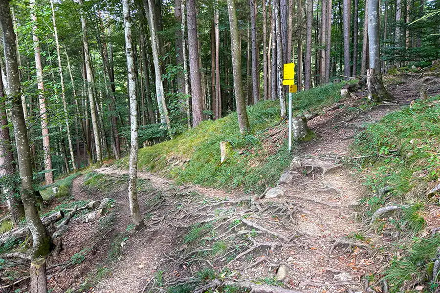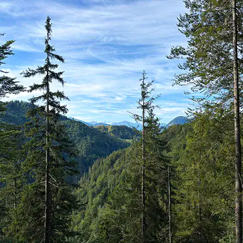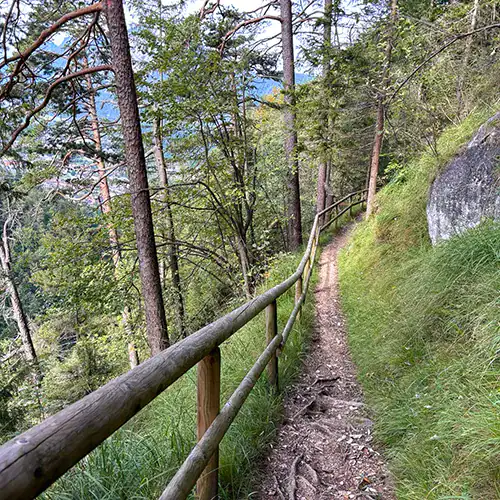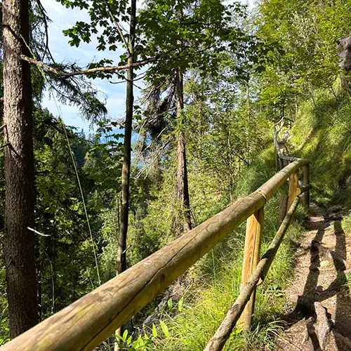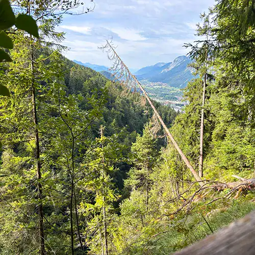 Je weiter mal talwärts gelangt, desto mehr ist dabei auch ein Blick ins südliche Inntal möglich. Vom Kienbach weit unten in der Klamm bekommt man nur sehr wenig mit. Das ist zu Zeiten von Schneeschmelze oder anhaltendem Regen sicher anders. Große Teile des Weges sind mit einem Holzgeländer gesichert. Aber wirklich anspruchsvoll ist der Weg abwärts nicht. Allerdings gibt es hin und wieder sehr wurzelige Abschnitte.