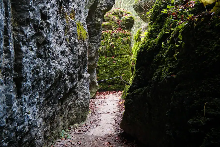 ein kleines, ruhiges Seitental bei Pottenstein in der Fränkischen Schweiz, geprägt von moosbedeckten Felsen und schmalen Pfaden